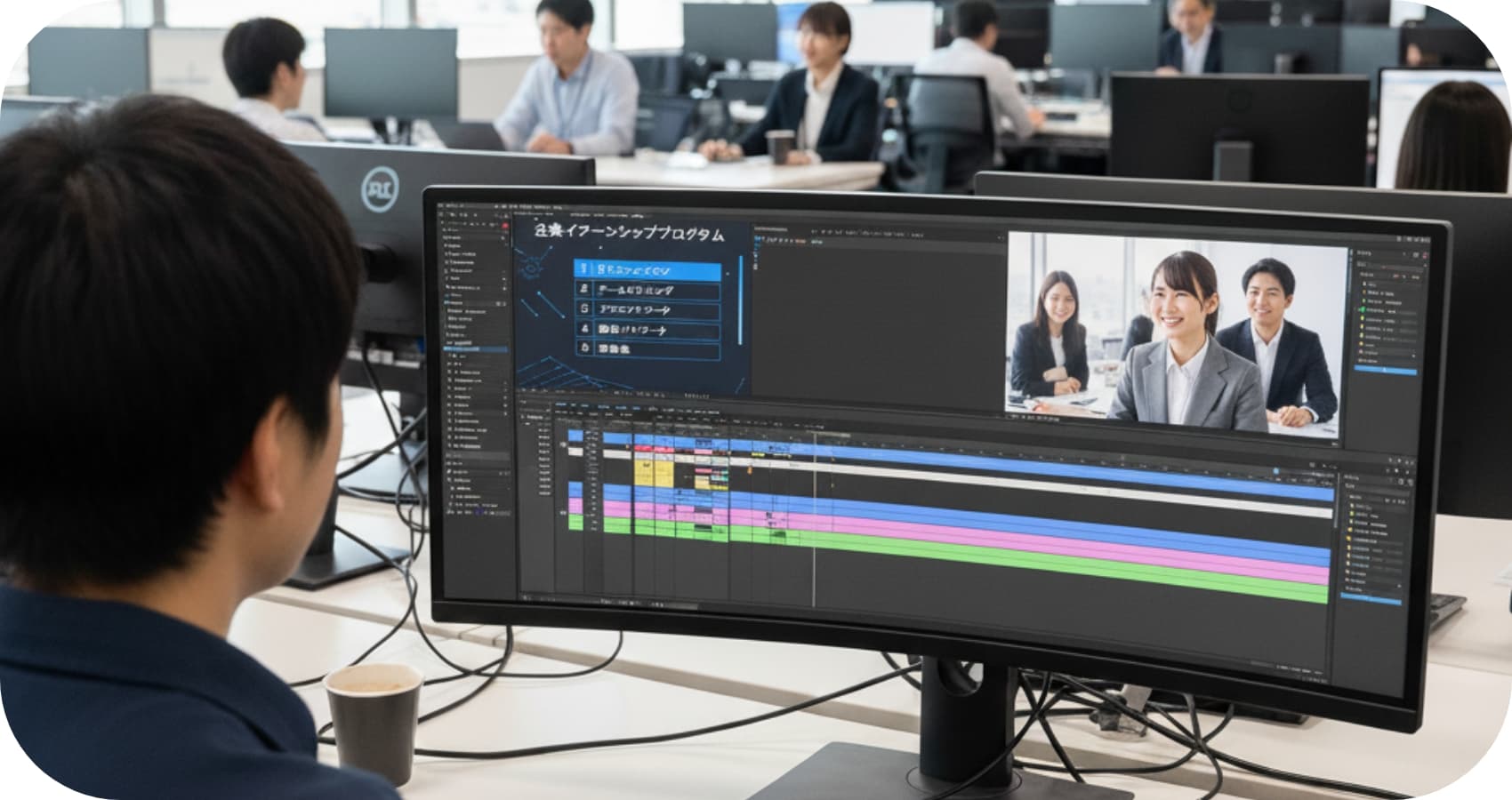 映像なら、カリキュラムのワクワク感を“映画予告”のように演出しつつ、先輩の本音コメントと実際のワーク風景で具体性を担保します。